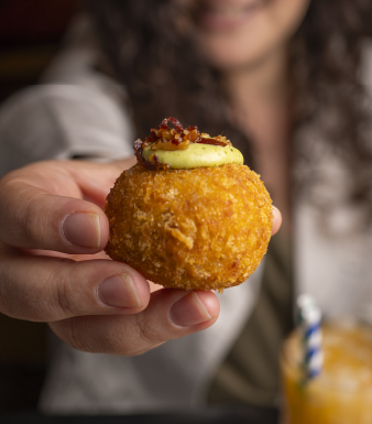 Croquetas de jamón elaboradas con bechamel cremosa y trocitos de jamón curado, rebozadas en panko, acompañada de una mayonesa de aceituna negra y padano.