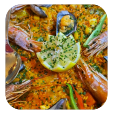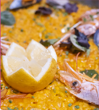 Paella al estilo lola con un guiso de ñora, mix de verduras, calamar, mejillones, almejas y gambón.